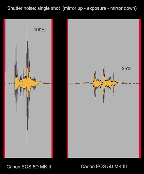 Canon EOS 5D MK III har ca 12 dB tystare enbildstagning än föregångaren 5D MK II. 25% ljudnivå! Det är makalöst bra! Lyssna på ljudfilen : Canon EOS 5DMKII - 5DMKIII shutternoise.mp3 Exakt hur detta har åstadkommits har vi begränsad information om idag. Tekniken man har infört kallar man pulsbreddsmodulering och den ger en långsamare arbetande slutare som har ett mindre smälligt ljud. Helt klart är att Canon lagt ner stor möda och lyckats uppnå påtaglig förbättring. Vi är mycket imponerade. Canon EOS 5D MK III är en utmärkt kamera för foto vid brölopp, konserter och teater- föreställningar. Åtskilliga fotografer kommer att köpa kameran för att få tillgång till denna funktion! Och i kombination med bättre bild- kvalitet på höga ISO blir den ett åtråvärt arbetsredskap för redaktionell och dokumentär fotografi där fotografen måste agera obemärkt i bakgrunden. Och få med sig bilder av hög kvalitet till uppdragsgivaren. Vi ger Canon höga poäng här och gratulerar deras teknikteam till väl utfört arbete! Video Videofilmningsfunktionen är något som definitivt måste anses vara en prestigefylld angelägenhet för Canon i denna kamera. 5D II var den första digitala systemkamera som har använts som huvudkamera i en Oskarsnominerad film. Och detta var något som Canon inte hade förutsett. Framgången har bl.a lett till att hackers skrivit om firmware för att ge 5D II tillagda funktioner som peaking, zebra- mönster, gain control, audio meter on display mm. Nya 5D III måste med nödvändighet tillvarata filmentusiasternas tilltro till kamerans videodel och ge dem ett ännu bättre intreface och fler kontoller. Hur långt har man då valt att gå? Det första man uppmärksamar är att kameran har fått samma utformning som 7D för val mellan stillbild och videofilmning. Det är intuitivt och snabbjobbat och helt klart en design som Canon kan stanna vid. Den efterfrågade hörlursutgången är nu på plats bredvid mikrofon- ingången på kamerans vänstra sida (sett från fotografen). På displayen får man upp visning av ljudnivån i stereo och ljudvolymen kan ändras under pågående filmning med hjälp av funktionshjulet på baksidan som Canon har gjort touch sensitive. Man kan justera videoparametrarna enbart genom att toucha det och i och med det har man kommit förbi problemen med klickanden som tidigare togs upp av den inbyggda mikrofonen på modellerna 7D och 5D MK II (m.fl). Filmaren har nu också fått tidkod i videoklippen och när man markerar filerna i Canons programvara får man upp alla kamerainställningar på samma sätt som på bildfilerna. Man har alltså nu tillgång till all metadata från kameran både vid stillbild och videofilmning. Videokvalitet Canon EOS 5D MK III har fått en uppdaterad teknik för videofilmningen och detta syns inte minst på filmerna i sig själva. Det redan tidigare diskreta bruset på höga ISO hos MK II har reducerats markant och inomhusfilmning i glödlampsljus blir i dagens läge så bra att det håller nära nog brodcastkvalitet. Canon visste att seriösa filmare skulle kasta sig över den nya modellen och börja med att testa video innan de fått av all skyddsplast runt kamerahuset. Och de som hoppades se mindre moaré och renare färger utan brus kommer inte bli besvikna! Särskilt tydligt blir detta under dåliga ljusförhållanden. Sökare Sökaren visar 100% av bildutsnittet och Canon använder nu samma LCD-display teknik som på 7D med varierbar sökarinformation. Bildvisning Man har på 5D MK III gjort det möjligt att jämföra fler bilder samtidigt och det är en mycket värdefull finess. Vid bildvisning på kamera- displayen sköts nu inzoomningen med funktionsratten för höger pekfinger. Det är ett koncept som andra tillverkare använt länge och nu tar Canon efter. Bättre eller sämre än tidigare? Ja, det är inte helt lätt att säga. Men det fungerar smidigt. Släktskapet med 7D och misstanken att vissa kommer frestas att ha båda dessa kameror i kameraväskan ger enda egentliga anledningen att beklaga flytten av bildzoomningen. För eftersom fotografen i allt övrigt har så lika användarinterface kommer han eller hon hela tiden leta på fel ställe när han (eller hon) ska snabbkolla sina bilder under en stressad fotografering. Det ger oss anledning att föreslå att Canon gör det möjligt för användaren att adressera om knapparna på BÅDE 5D III OCH 7D i en kommande firmware update. Ges fotografen möjligheten att välja den för sig mest lättjobbade inställningen på bägge kamerorna så kommer både humör och arbetsflöde förbättras avsevärt. Är det möjligt Canon? Kan det åstadkommas? Bildjustering I likhet med Pentax och Nikon har Canon nu också infört intern RAW-konvertering med bildjustering och färgkorrigering. Fotografer som jobbar på fältet och vill skicka hem bilder till en redaktion kan därmed göra den första delen av justeringsarbetet redan i kameran och spara tid och styra utseendet själv i stället för att vara beroende av en person på mottagarsidan. En värdefull och viktig funktion som sport- och nyhets-fotografer frågar efter. Om du använder ett Canon-objektiv så korrigerar 5D MKIII bort eventuell kormatisk aberration innan bilden skrivs ner på minneskortet vilket gör det möjligt att fotografera i jpeg med hög bildkvalitet och spara plats på kortet. Fotograferar du i RAW kan du ta bort sådana fel i datorn efteråt, medan det är mycket svårare att få till det exakt när du enbart har bilden i jpeg-format. Det kanske inte är en stor skillnad för alla men du som står på savannen framför ett lejon som slåss med en elefant när det bara finns plats för 10 RAW-bilder på minneskortet kommer att vara tacksam emot Canon. Du ställer snabbt in kameran i jpeg-läge och kan ta 200 bilder med en hastighet av 6 bilder i sekunden. Sen åker du hem och vinner medalj för årets bästa naturbild. Utan kromatisk aberration. Menyer Men