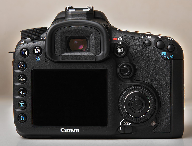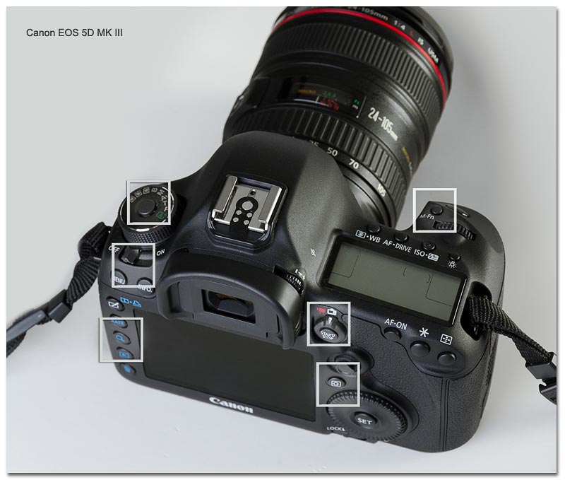 Här ser vi Canon EOS 5D MK III i jämförelse med den två år äldre EOS 7D. Canon har valt att återanvända 7:ans framgångsrika design som innebär att bland annat strömpåslag och omkopplaren för videofilmning har flyttats. Layoten på 5D MKII har helt klart sett sina bästa dagar och 7D har fått gott betyg på ergonomifronten. Inte desto mindre har man fortsatt fila på konceptet och flyttat några omkopplare och knappar. Bland annat har nedbländningfunktionen lokaliserats på andra sidan av kamerahuset där vi länge hoppats få se den placerad. Batterigreppet har också försetts med en egen joystick för smidigt arbete i porträttläge. Den stora ratten är som sagt touch sensitive och kan nu användas för att ändra inställningar under videoinspelning utan risk för störande ljud in i kamerans mikrofon. Elegant löst av designteamet! Canon har nu flyttat Q-knappen till rätt plats (!) och den ljuskänsliga sensorn placerades därför istället under displayen. Här har vi ringat in några av de viktigaste förbättringarna i layouten. Det är en rätt omfattande uppgradering som synes.