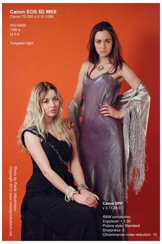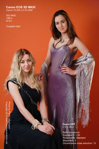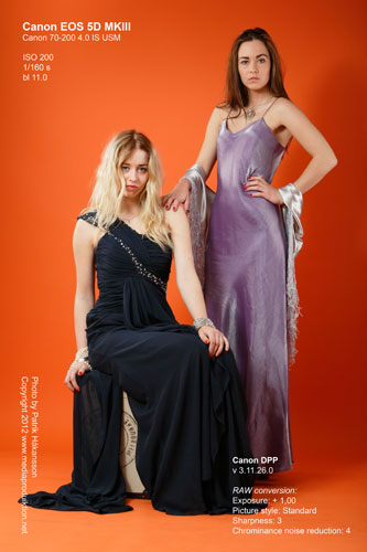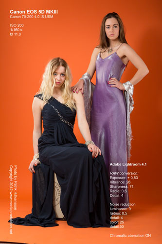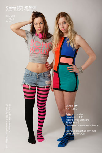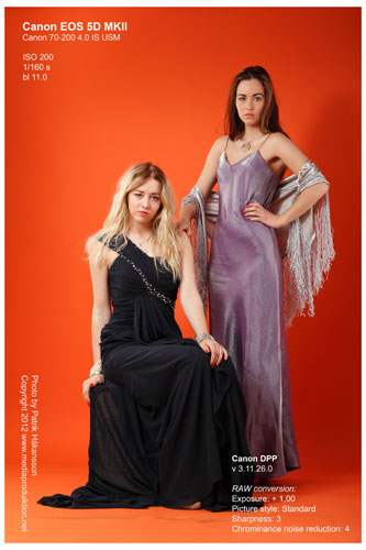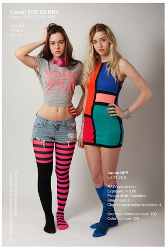 April 2012. Patrik Håkansson testar Canon EOS 5D MK III All Rights Reserved by www.mediaproduktion.net Testbilder: Studio I denna test har vi jämfört Canon EOS 5D MK II och 5D MK III sida vid sida i RAW-läge. Bilderna har processats i Canons egen programvara Digital Photo Professional med samma inställningar för båda kamerorna. Vi har fått lite att fundera på och möjligen har Canon valt att försaka lite detaljskärpa vid designen av 5DIII:s nya moiree-filter. Detta skulle kunna vara skälet till att man har lyckats så bra med reduceringen av moiree vid videofilmning. Den som köpte sin MK III tidigt i år ska ladda ner den uppdaterade versionen av DPP där man har löst problem med upplösningen i RAW-konverteringen. Vi ber läsaren att ge testbilderna en ordentlig granskning och göra sig en egen uppfattning om resultatet. Men vi sluter oss till att man på Canon vid designen av nya 5D MKIII har valt att lägga betydligt mer energi än tidigare på att efterbearbeta bilderna för att uppnå ett maximalt resultat. RAW-bilder från 5D MKII och MK III skiljer sig inte mycket åt och i vissa lägen tycks den nya kameran ha sämre prestanda i såväl upplösning som vad gäller brus i skuggpartier vid låga ISO! Detta föranleder djupare studium när vi har möjlighet att åter ta in 5D MK III i studion för andra delen av testet. Den uppmärksame läsaren ser att utsnitten är olika stora och detta har att göra med kamerornas olika prismasökare. Nya 5D MKIII visar 100% av bildutsnittet medan 5D MK II maskar bort några procent. Detta lurar fotografen att backa med 5D MKII för att uppnå samma bildresultat i sökaren. Om man istället fotograferar med Live View så ser man 100% av bildutsnittet - dvs exakt lika på båda kamerornas respektive bilddisplay. Den vita kanten på bilderna tagna med 5D MK II visar skillnaden i pixelantal mellan kamerorna. Klicka på bilderna för att se dem i full upplösning.