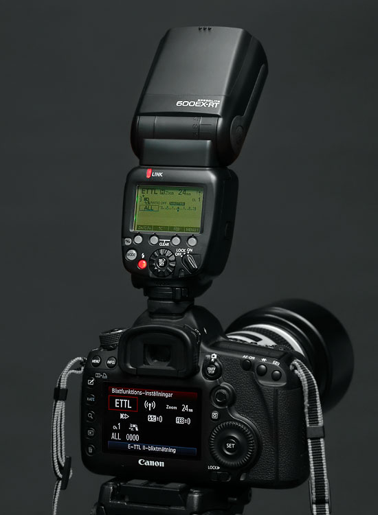 Under videofilmningen kan man avlyssna ljudet i hörlurar (minitelekontakt) och nivån på inspelningen visas på bilddisplayen. Testbilder: Blixtbilder tagna med Canon 600EX RT 600EX RT är Canons första radiokontrollerade blixt. Det är en naturlig utveckling till en nivå som ger professionella fotografer ett mycket säkert och lättjobbat system. Blixten har en stor och överskådlig display som kompletterar kamerans dito och gör blixtarbetet snabbt och effektivt.