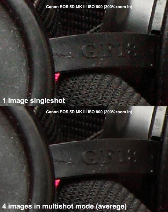 Slutresultatet Testbilder: Multiexponering Den andra multibildfunktionen i 5D MK III gör det möjligt att addera flera exponeringar till en slutlig bild antingen i RAW eller jpg-format. RAW-filen kan du sedan justera färg, ljus och skärpa på. Däremot kan du inte göra en justering av objektiv- distorsion som annars är möjligt i Canons RAW-konverteringsprogram DPP med övriga RAW-bilder. Kameran rättar inte heller till misspass i detta läge. En av de mest attraktiva insatserna man KAN göra är att minimera artefakter från sensorn. Vid blixtfoto med stativ ger det enastående RAW-filer som har en ruskig detaljrenhet. Här ser vi skillanden mellan en vanlig bild och fyra delbilder som slagits ihop i kameran i Multishot-läge. För den som är tekniskt driven ger den ökade integriteten på RAW-filen spännande möjligheter att konvertera med RAW-program från t.ex DxO som gör ett mycket bra jobb med att sampla upp bildens storlek i samband med konvertering till TIFF-format. Upp till 66 megapixelstorlek kan man då få på den slutliga bilden. Är pixlarna rena och fria från artefakter blir bilden enastående detaljrik och snygg!! Vi återkommer med test- bilder på det lägre fram på annan plats på vår hemsida.