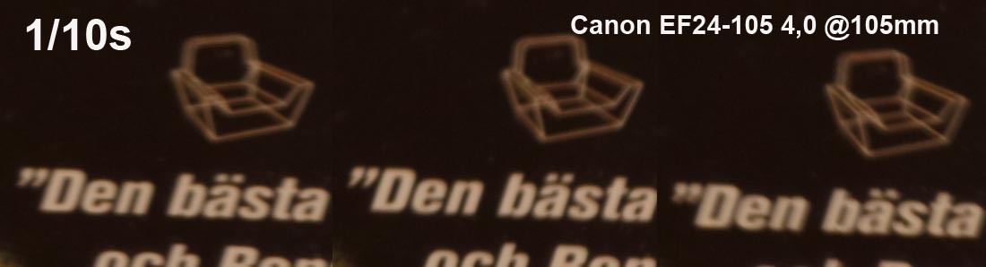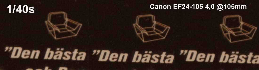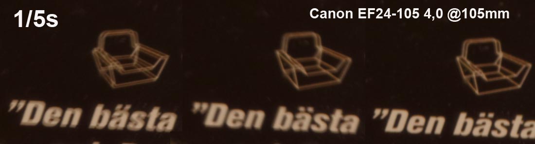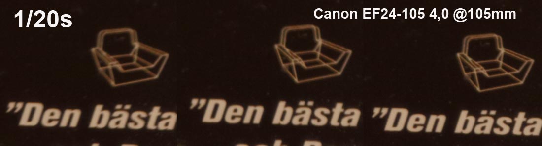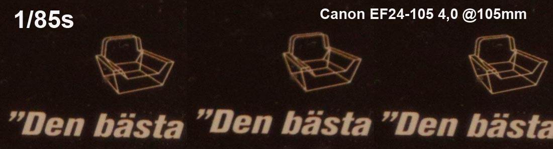 EF 24-105 IS USM @ 45 mm f:7,1 Canon EOS 5D MK III 1/125s ISO 100 Detalj 1: Lågkontrastdetaljering Detalj 2 : ljusöverstrålning Detalj 3 : Färgkontrast och blödningsegenskaper 3. Bildstabilisator test