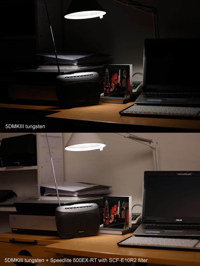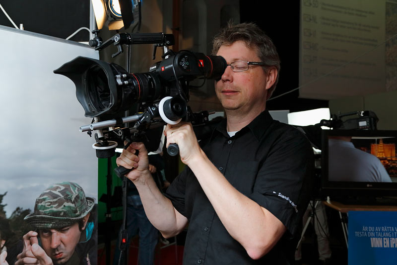 I blandljus trivs 600EX RT bra. Här har vi riktat blixten på kameran åt vänster och slår blixtljuset mot vägg. Slutresultatet är välbalanserat. Scandinavian Photos representant demar Canon 5D monterad på rigg för filminspelning. Tack vare den höga ljusnivån blixten kan leverera klarar den att lysa upp motiv också i stora rum med indirekt blixt. Nytt är att Canon nu satsar på ett system med lösa färgfilter som placeras i en transparent filterlåda framför bixtröret. De kan ha alla tänkbara färger såklart. Som standard levereras blixten med två filter avsedda att anpassa blixtens färg till glödlampsljus. Det gör det lätt att ta interiör- bilder i hemmiljö och kamerans automatiska färgbalans fungerar mycket bra. Bildresultatet är färgrikt och behagligt.