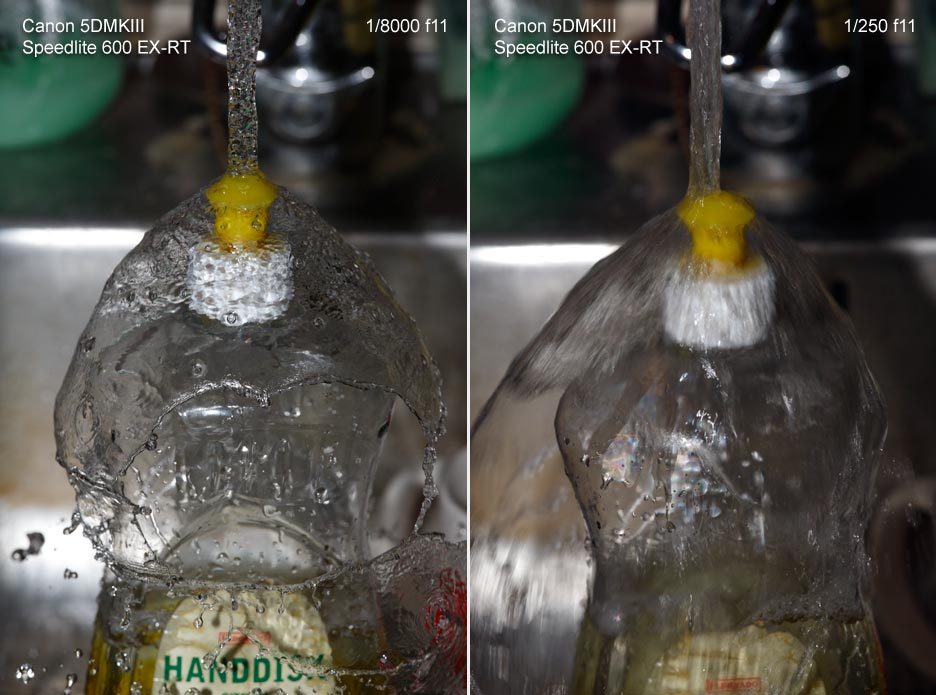 Canon 600EX RT riktad mot väggen bakom fotografen ger ett mjukt ambienceljus som bevarar stämningen i motivet. Canons blixtar har redan tidigare haft ett höghastighetssynk för att kunna jobba med kortare slutartider än 1/200 sekund. Här ser vi att en elektronblixt med synktiden 1/250 sekund inte räcker till för att frysa riktigt snabba förlopp. För att uppnå det behöver kameran en mycket kortare slutartid. I det här fallet 1/8000s - kamerans snabbaste. Bilden återger rinnande vatten.