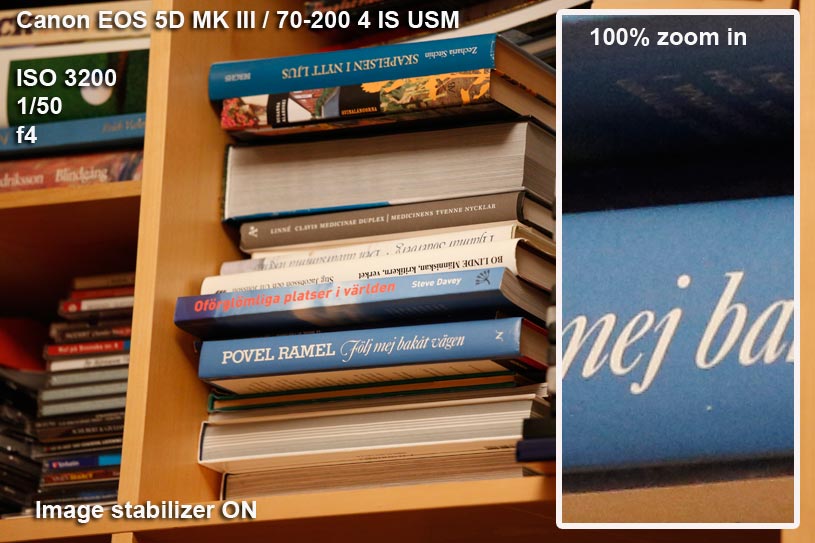 Testbilder: Bildstabilisering Anledningen till att vi berör denna funktion är att vi märker en förbättrad bildstabilisering med 5D MK III jämfört med 5D MK II. Gyrot snurrar möjligen snabbare vilket ger en ökad stabilitet vid långa slutartider. Fler rutor än tidigare blir därför skarpa inte minst med långa teleobjektiv. Det ger större frihet att fotografera på fri hand under dåliga ljusförhållanden! Denna bild är tagen i glödlampsljus med 200mm brännvidd.