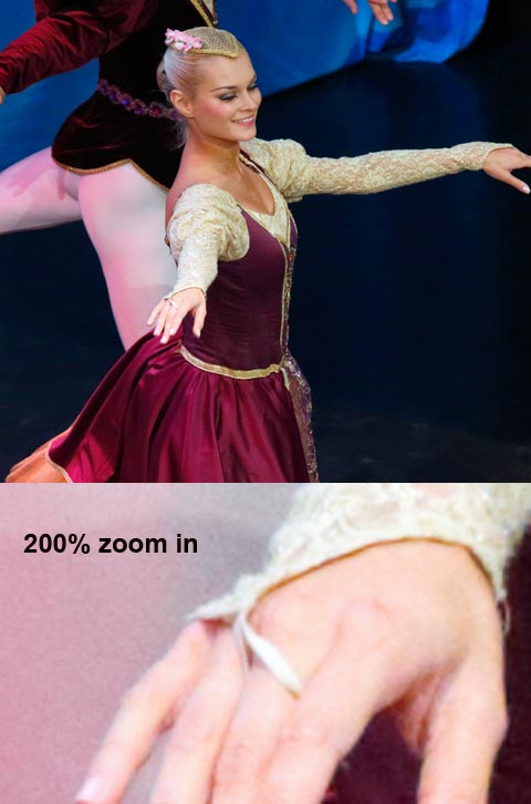 Testbilder: Dans - Autofokusering i svagt ljus I svagt ljus hittar 5D MK III lätt fokus på rörliga objekt som här vid en balettföreställning. Skärpan sitter oerhört bra och man får en känsla av att kameran vet vad man helst vill se i fokus. Vi använde givetvis kamerans nydesignade scilent mode som gör 5DIII nära nog ljudlös, eller i alla fall enastående diskret. Några meter bort hör man knappt kameran arbeta! Jämfört med Nikon D600 som är Nikons tystaste (och nyaste) DSLR-kamera är 5D MK III helt klart den som drar minst uppmärksamhet till sig. Bilden är tagen med 200mm och bländare 4,5. Full öppning är 4,0 så skärpedjupet är inte stort här. Felfokus syns ofrånkomligen.