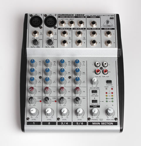 Zoom H4N och Koss Porta Pro hörlurar Har du väldigt många ljudkällor som du vill styra så kan det vara en idé att skaffa en ljudmixer. Det finns många bra men de flesta behöver anslutas till ett nätströmsuttag. Om du jobbar inomhus är det sällan ett problem men du bör överväga dina behov före ett köp. En av de mer prisvärda alternativen är Behringer UB 802 som har två högklassiga mikrofoningångar med 48 volts phantom- matning avsett för proffsmikar. Sedan har den två stereoingångar. Alla 6 kanaler har en trevägs equalizer och panorering och en volymkontroll. Du kan där också skicka ut en alternativ ljudmix i mono med individuell volymjustering från varje kanal. Som ett komplement till stereoutgången. En extra stereoingång tar emot ljud som inte behöver filtreras och den har enbart volymkontroll. Du kan ansluta hörlurar och mixern har totalt tre olika stereoutgångar med två olika volymkontroller. Denna enhet är lätt och kan hantera flera externa ljudkällor på en liten arbetsyta. Kompetent för sitt pris och perfekt för den som är på resande fot.