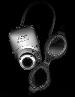 PowerShot D10 i praktiskt bruk Undertecknad har tagit fasta på undervattensfoto för denna test men det ska sägas att kameran tar bra bilder på landbacken. Bra färger och bra stuns och sting i skärpan och kontrasterna. Det är hög upplöning och bra vitbalans i dagljus. Du som vill ha en liten vattensäker kamera med dig i båten eller på stranden kommer alltså att få bra bilder med D10. Optiken presterar bäst i vidvinkelläge och bild- stabilieringen fungerar bra. Nu återstår att se om det goda intrycket kommer att bestå under vattnet. Vi tar i första hand bilder strax under vattenytan, utan att snorkla eller använda dykutrustning. Bilderna tas på djup mellan 40cm och 2 meter. Testfotograferingen görs i en inomhusbassäng och motivet är en simmande fotomodell! Det är lite lek och mycket seriöst. Det här ska bli SNYGGA bilder är det tänkt. Vi tar oss an uppgiften att utföra en modellfotografering UNDER vattnet. Take a deep breath! Först ett par ord om säkerhet under arbetet. Ha en eller två personer som är med dig hela tiden du fotar så att du kan fokusera på bildarbetet. Dina medhjälpare har koll på omgivningen och hjälper dig och de som du fotar om något problem uppstår. Om dina medhjälpare är livräddningskunniga så kan du lättare ta en del våghalsiga bilder utan att känna rädsla för att hamna i ett panikläge i en nödsituation som du inte kan hantera ensam. Nästa sak som du ska ha är tätslutande simglasögon eller cyklop. Se till att de är ofärgade för att se bilden på kameradisplayen så tydligt som möjligt. Om du står ovanför vattenytan och kameran är under vatten så upptäcker du att vattenytan skapar en brytning som gör det omöjligt att se sökarbilden tydligt. Du måste ner under vattenytan för att se det som visas på skärmdisplayen! Det är nu ett av de stora problemen uppstår. Om du är en normal männsika så flyter du upp till ytan. När du har huvudet under vattenytan i höjd med kameran så börjar olika delar av kroppen flyta uppåt mot vattenytan. Det här är inga nyheter men faktum är att inte bara en djupdykare utan även nybörjarfotografen behöver hänga på sig tyngder för att stanna i rätt position under vattenytan. Därför ska du ha ett bälte om midjan. I bältet färster du 4 snören med öglor. I öglorna hänger du 2 st 10-kilosvikter och 2 st 5-kilosvikter. Sen provar du på grundt vatten hur mycket du sjunker eller lyfter med olika många tyngder. Du märker att ju mer luft du har i lungorna desto mer lyfter kroppen. Så om du släpper ut luft under vattnet medan du dyker så minskar din flytförmåga. Om du inte är uppmärksam när du dyker och fotograferar kan du i ett läge som detta plötsligt upptäcka att du sjunkit snabbare än du förutsett och kanske kommit långt under vattenytan. Då ska du genast haka av tyngderna och börja simma mot ytan. Två saker som är bra att ha ordnat då är: 1. Tyngderna är inte så dya att du tvekar att göra dig av med dom. Tillverka dem själv av sand eller grus. simma. Om du använder PowerShot D10 och Gorillapod så märker du att den kombinationen flyter av sig själv. Praktiskt! Att undervattensfotografera med D10 är bökigt om du inte har en Gorillapod eller motsvarande. Så fort du vill ändra en inställning så kommer du riskera att tappa greppet om kameran. Med Gorillan är det lättare. Fort- farande så kommer du i 9 fall av 10 ställa in kameran ovanför vattenytan mellan två dyk. Så lägg upp arbetet på det sättet. Ett dyrt alternativ är att skaffa två kameror och montera dem på en kombinationsskena. Så kan du ha den ena inställd på filmning och den andra på stillbild. Eller en kamera med lågt ISO och blixt - den andra med högt ISO utan blixt. Ja det finns många kombinationer som skulle kunna vara användbara. En sak som är bra med D10 är att batteriet räcker till många bilder. Särskilt om man inte använder blixt så ofta. Automatiken för fokus och exponering tar ett par sekunder på sig att ställa in så man får vänja sig vid att rikta in sig på sitt motiv i god tid innan man tar första bilden. Den stora problematiken kommer om man vill ta långa bild- sekvenser. För det första så kan D10 ta riktigt bra bildserier med tanke på 12megapixelstorlerken. Det är fullt tillräckligt för de flesta. Men problemet är att man under serietagningen inte ser vad som händer framför kameran på bilddisplayen. Tar man bildsekvenser med kontinuelig sekvenstagning så visas i stället den senaste exponeringen i ca 1 sekund under det att bilden skrivs ned på kortet. Tyvärr kan inte kameran ställas in för att visa LIVE vad man siktar på med kameran i stället för att visa senast tagna bilden i den pågående bildserien. Det gör det mycket svårare att hålla koll på om snabbt rörliga motiv är på väg ut ur bilden. Man ser det först efter att det redan inträffat och då ser man det på en stillbild av den senaste tagna bilden. Ja. jag tror ni förstår nu. För att ha en chans att hänga med i svängarna så gäller det att inte bara titta på displayen utan också titta upp och granska vad som händer framför kameran. Och sedan försöka gissa hur man ska rikta kameran för att få en bra bildkompostition. Ja vad ska man säga. Det är värdelöst helt enkelt! Det här är en av de saker som jag invänder starkast emot i designen för som det är nu så sumpar man många snygga bildmöjligheter och kompositionen av en actionbild är som att spela på lotteri. Det är flummigt tänkt av Canon och kameraarbetet känns amatörmässigt. När du visar bilderna du tagit kan den du fotograferade tro att du är en diletant som inte ens kan sikta på ditt motiv. En männsika som simmar under vattnet. - EN STOR SAK mitt i bild. HUR svårt kan det vara??? Så Hallå, Hallå Canon. Det är ert jobb att bygga en kamera som funkar bättre än såhär. Om ni inte kan fixa det på annat sätt så skicka med ett gratis ti