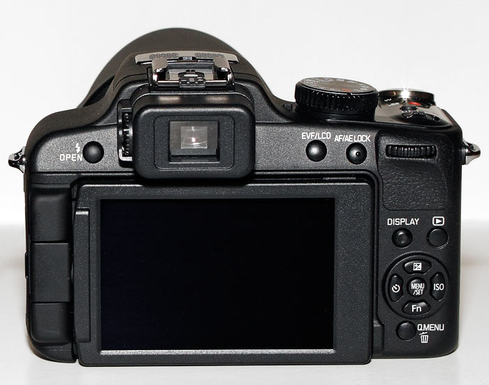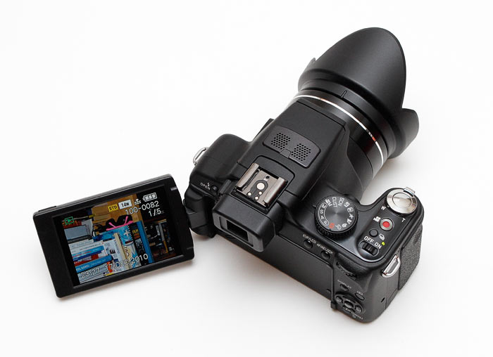 Trots likheterna med äldre modeller är detta en kamera som inger större förtroende än sina föregångare. Allt från stereomikro- fonen, den vinklingsbara skärmen och den underbara omkopplaren på objektivet för växling mellan manuellt och automatiskt fokus, till filminspelningsknappen och tumhjulet med dubblerande tryckknappsfunktion talar samma språk. Den här kameran är ämnad att ge fotografen optimala förutsättningar för ett exakt och smidigt arbete. Designen är kort sagt Strålande!! Och nu har man riktat denna kamera ännu mer mot den seriöse fotografen i och med blixt- skon som tillåter ägaren att använda en stor elektronblixt i stället för den interna blixten. 1. Display och sökare Displayen är kort och gott perfekt. Högsta betyg där! Okularsökaren har i stort sett samma utseende och kvalitet som tidigare i Panasonics produktkedja. Den lämnar övrigt att önska optiskt men är en aning bättre än förut när det kommer till uppdate- ringen. Man blir inte lika sjösjuk. Delvis beroende på att man valt att låsa bilden så att den inte hoppar till vid minsta läges- förändring. Nu rör den sig först om kameran vrids mer påtagligt och sedan vilar den när kameran åter pekar fast mot nästa objekt. Fortfarande är kamerans stora display OÄNDLIGT mycket bättre att jobba med så det framstår som en kvarvarande akilleshäl att Panasonics tekniker inte kan ta fram en sökare som inte känns som att den tillhör en leksakskamera.