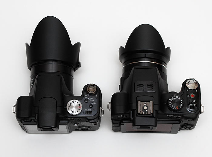 Panasonic DMC FZ28 till vänster och Leica V-Lux 2 till höger. Nytt är den vinklingsbara skärmen med en radikalt förbättrad antireflexbehandling som gör användningen av kameran i dagsljus och vid filmning betydligt smidigare. Ljusstyrkan på display- en varieras automatiskt beroende på omgivande ljus och den funktionen fungerar väldigt bra. Knapparnas placering och funk- tionernas utformning är av högsta klass. Denna kamera har inga direkta svagheter utan ger ägaren enastående god kontroll över alla funktioner. Man har gjort läxan väl. V-Lux 2 är både gediget och stadigt byggd och ligger bra i handen. Optiken som Leica själva tillverkat är alltjämt mycket kompakt med tanke på omfånget. Översatt till småbildsformat har den ett omfång på 24x med en brännidd från 25mm till 600mm. Det är mer än tillräckligt för gemene mans normala behov och i och med att skärpan är hög och distorsionen föredömligt låg är objektivet kamerans starkaste kort. På resande fot kan man knappast få ett mera praktiskt koncept än så här! På FZ28 satt motljusskyddet stilla under zoomning, fäst i den yttre ringen runt optiken. På V- Lux 2 fäster det på den optiska del som rör sig så hela paketet flyttar sig nu. Därför klarar man sig med ett mindre motljusskydd än tidigare och i infällt läge ger det en kompaktare kamera som får plats i en mindre väska än tidigare. Skillnaden är inte enorm men dock påtaglig och varmt välkommen.