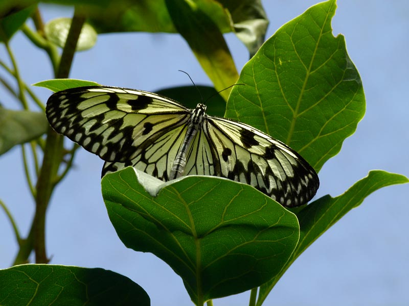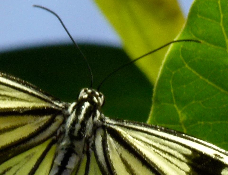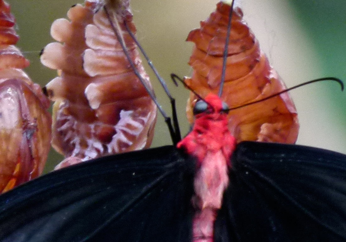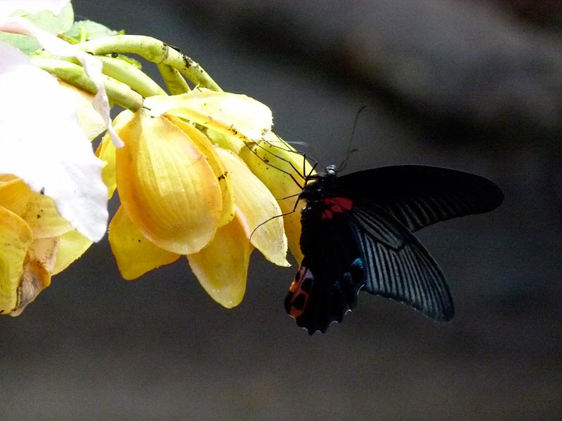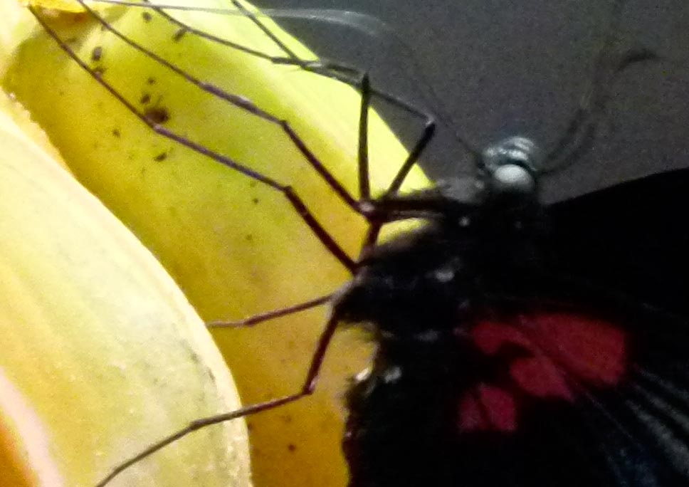 Leica V-Lux 2 1/125 sek, bl 4.5 ISO100, image stabilizer ställd på AUTO mode. Klicka för att se en delbeskuren bild i originalupplösning. Några hundra meter från pulkabacken ligger Fjärilshuset på Haga. Här kan man se tropiska fjärilar i ett tempererat växthus med 26 graders värme och 100% luftfuktighet! Närmare än så här kommer vi inte förutsättningarna en fotograf har under fotografering i en tät regnskog i Amazonas. Nu ska vi testa hur kameran kan fånga djur och växter på bild i svagt ljus i tropikerna. Samtliga bilder togs i jpg-format med högsta kvalitet och minimal brusreducering.