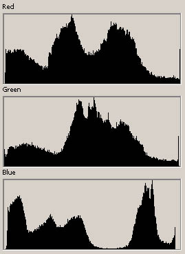 Histogram för bilden till höger. Uppdelat i röd, grön och blå färgkanal. Nästa sida: Bildkomposition |