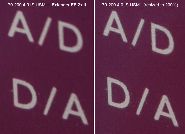 Till vänster har vi använt extendern och fördubblat brännvidden. Till höger ser vi en 2x förstoring av samma motiv taget utan extendern påkopplad. I realiteten ger extendern inga nya detaljer i bilden utan ger visuellt en sämre bildkvalitet som kräver uppskärpning för att matcha resultatet UTAN extender. I svagt ljus så kommer dessutom problem med minskat skärpedjup och långa slutartider som en följd av den försämrade ljusstyrkan på kombinationen av teleoptik och extender tillsammans. Som helhet betraktat är med andra ord en extender som inte kan ge högre bildkvalitet än Canon EF 2x II ute- slutande till nackdel för bildresultatet. Tillsammans med en äldre digitalkamerna med en stor sensor med få pixlar kan man däremot räkna med att kunna ha god nytta av en extender - och det gäller i första hand inte allt för kontrastrika motiv och gärna i fullt dagsljus. En 5-10 megapixel systemkamera med full frame-sensor är en extra lämplig kandidat. För att visa på potentialen tar vi samma motiv med Canon EOS 5D MKII full frame 21 megapixel. Bländare 11. Kameran har egentligen "för hög" upplösning men har ändå större "per pixelyta" än Canon EOS 7D. Därför ser man inte lika stor skillnad mellan bilder med och utan extender. En 10-megapixel full frame har mest nytta av en extender. Tyvärr kan vi inte visa upp bilder på det i denna test. Canon EOS 5D MKII samt Canon 70-200 4.0 IS USM. Utan extender. (Bilden förstorad till 200%).