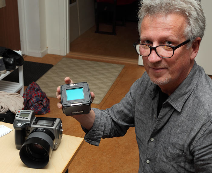 Klicka för att se delutsnitt av bilden i 100% upplösning. Storleken på delutsnittet är 7031x2576 pixlar = 18.1 megapixel Vänligen ha i åtanke att bilderna är konverterade till jpg med komprimering. Artefakter kan förekomma i vissa delar av bilderna. Här kan du se och själv jämföra delar av samma motiv tagna i multishot 200 megapixel. (utsnitten är i original- uppösning). Klicka för större bild. Detaljåtergivningen i 200 megapixelbilden är skrämmande bra. Likafullt så misstänker artikelförfattaren att det går att utvinna ännu mer mikroinformation om man får tillgång till uppskärpningsparametrarna och kan ställa ned den oskarpa masken till minimum vid exponeringen. Man anar på vissa ställen att uppskärpningsartefakter äter upp de sista procenten av detaljer i bilden. Men även i originalskick så är tekniken kapabel att öka den användbara storleken radikalt på utskrifterna tagna med Hasselblad H4D 200 MS! Här ser vi bakstycket till Hasselbladaren i handen på Hansa från GOECKER som ställde upp och demade kameran vid vår test.